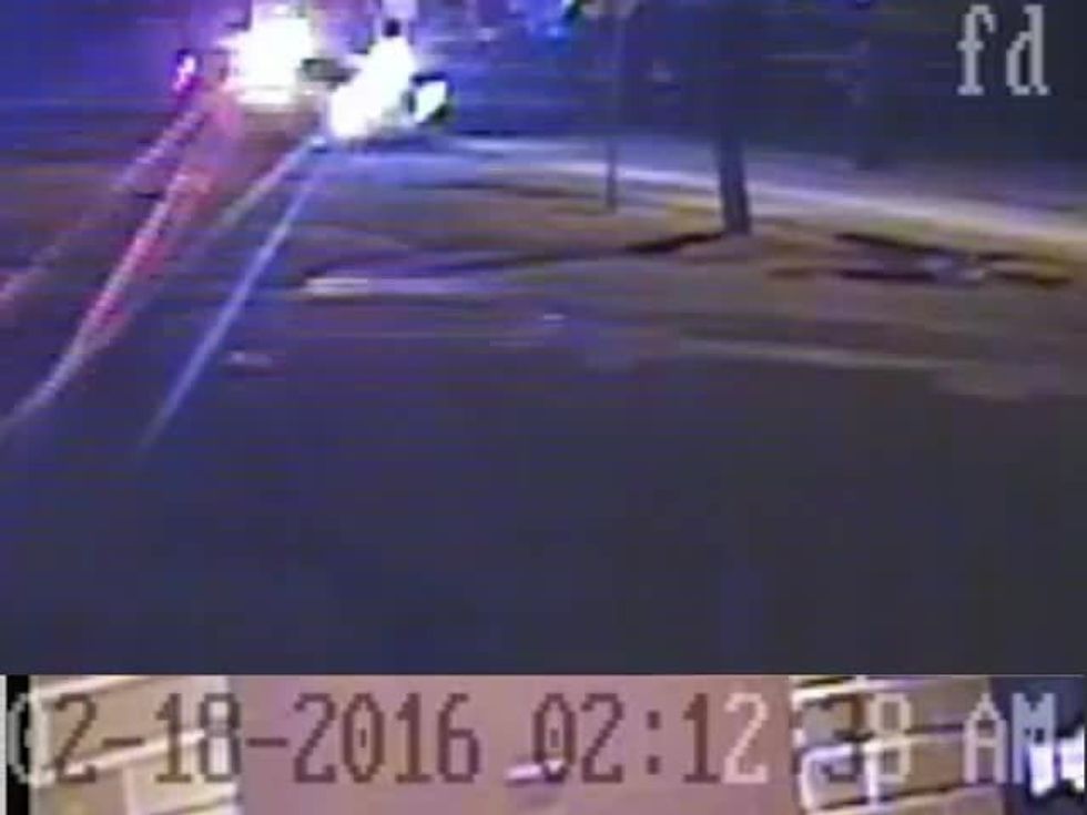 The suspect who gets out of the car appears to put something on the ground and then stand up with his hands raised. Meanwhile, the officer begins to approach the suspect and then fires his weapon when police say the suspect makes a sudden move.