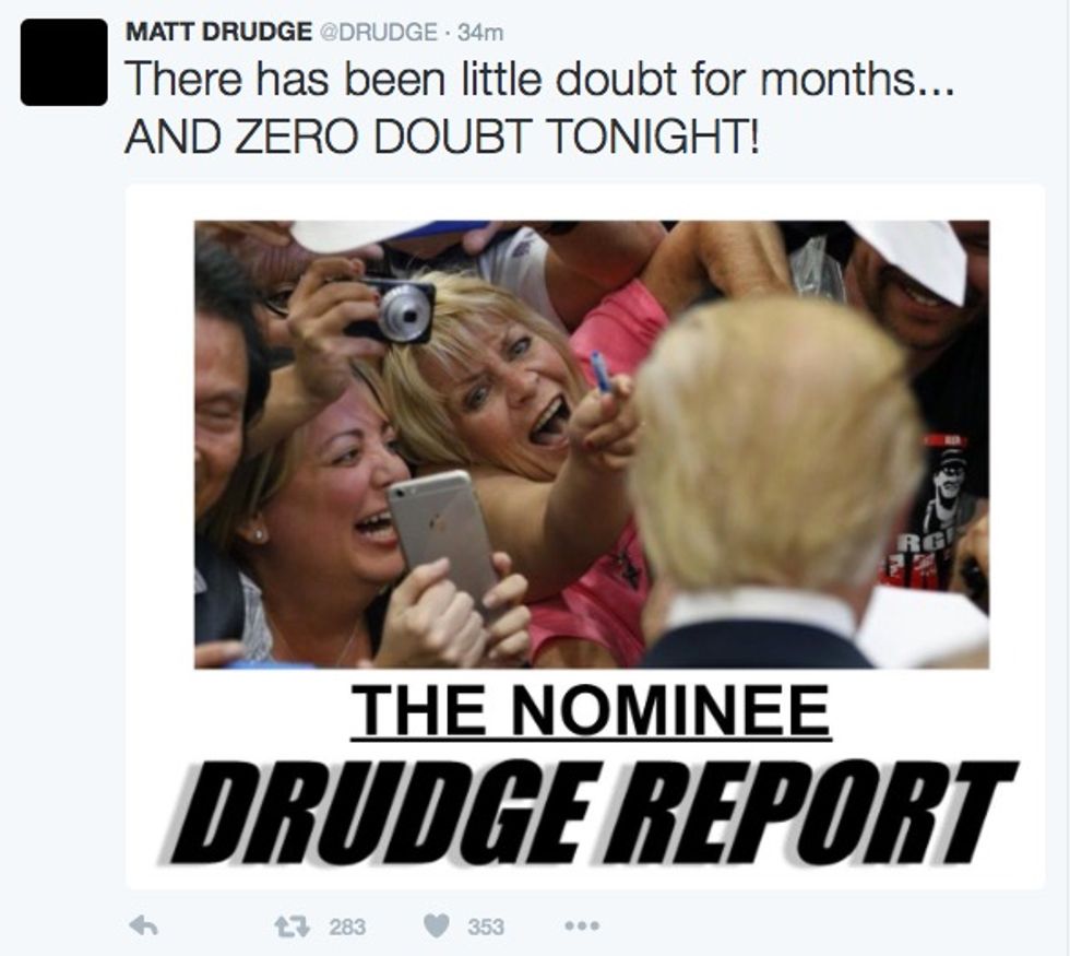 Internet news mogul Matt Drudge has called the Republican race for Donald Trump.