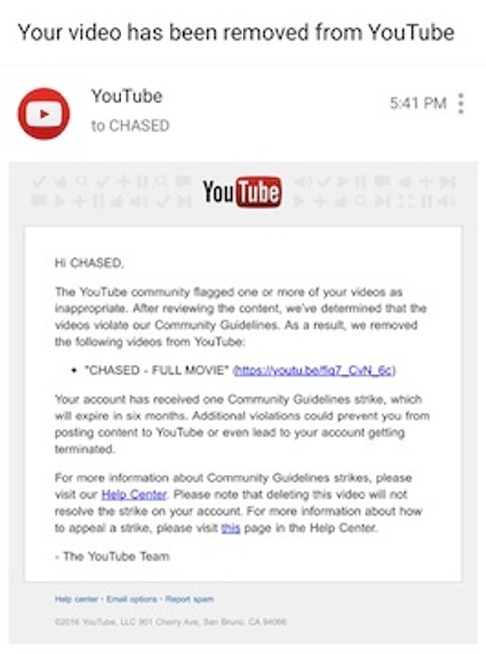 Almost a week later, Brian got another email from YouTube informing him his video did not in fact violate the Community Guidelines.
