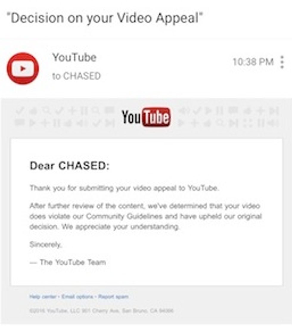 After a few hours, he got this email from YouTube: “After further review of the content, we've determined that your video does violate our Community Guidelines and have upheld our original decision.”