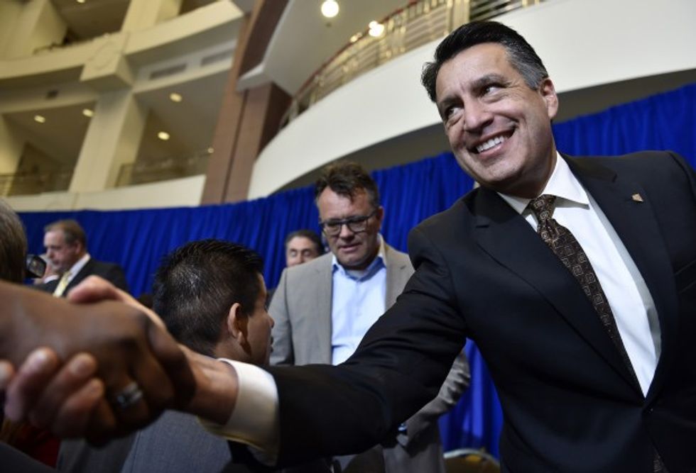 Nevada Gov. Brian Sandoval shakes hands with attendees after a news conference in Las Vegas, Dec. 10, 2015. (AP Photo/David Becker)