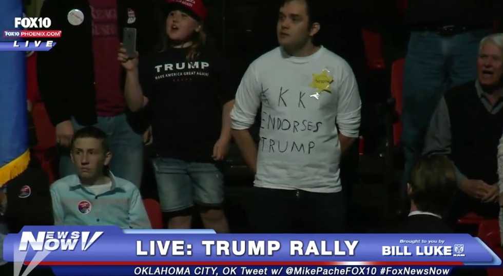 A man protesting Republican presidential candidate Donald Trump stood up at an Oklahoma City rally Friday and stuck his tongue out at the billionaire — all while donning a "KKK endorses Trump" shirt.