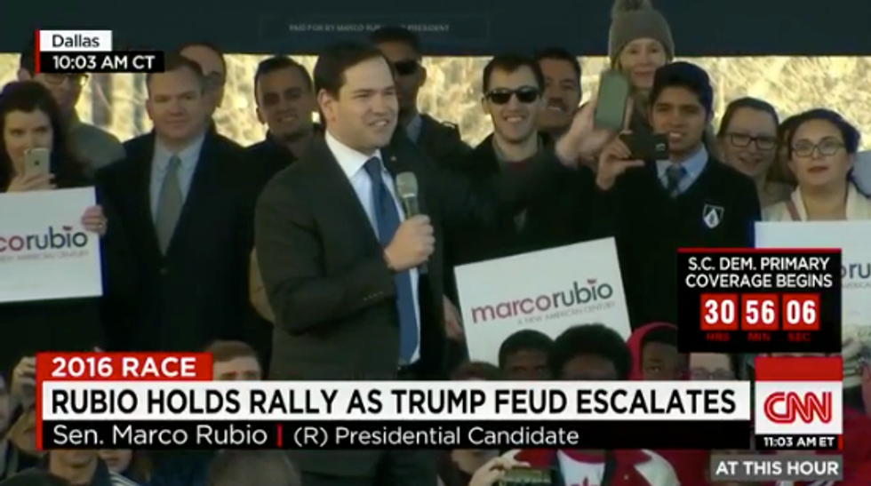 During a campaign rally in Dallas Friday morning, GOP hopeful Marco Rubio mocked front-runner Donald Trump, jokingly accusing the businessman of wetting his pants during Thursday's tense debate. He also bashed Trump for his Friday morning Twitter tirade.