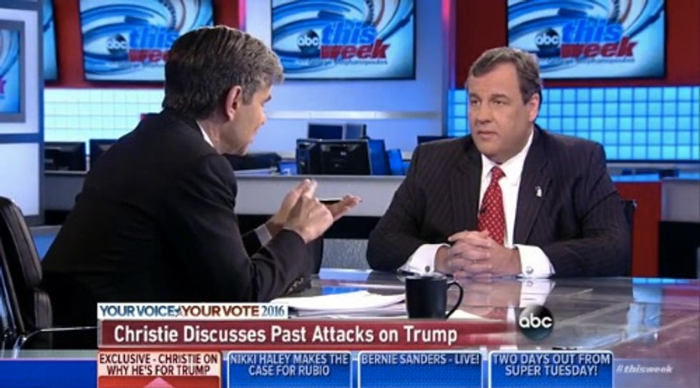 New Jersey governor and former Republican presidential candidate Chris Christie appeared on ABC's "This Week" Sunday morning to discuss the decision he made this week to endorse Republican front-runner Donald Trump.