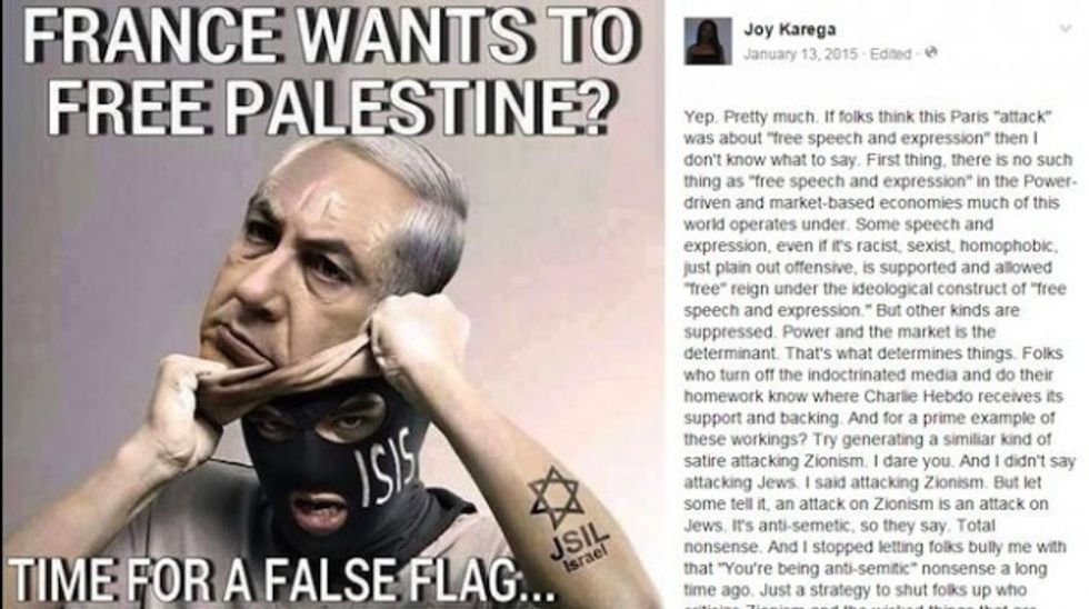 The Tower reported that Karega’s social media posts have included blaming Israel for the deadly attack on the Charlie Hebdo magazine office in Paris and promoting a video in which Nation of Islam leader Louis Farrakhan said that “Israeli and Zionist Jews [were] in key roles in the 9/11 attack.”