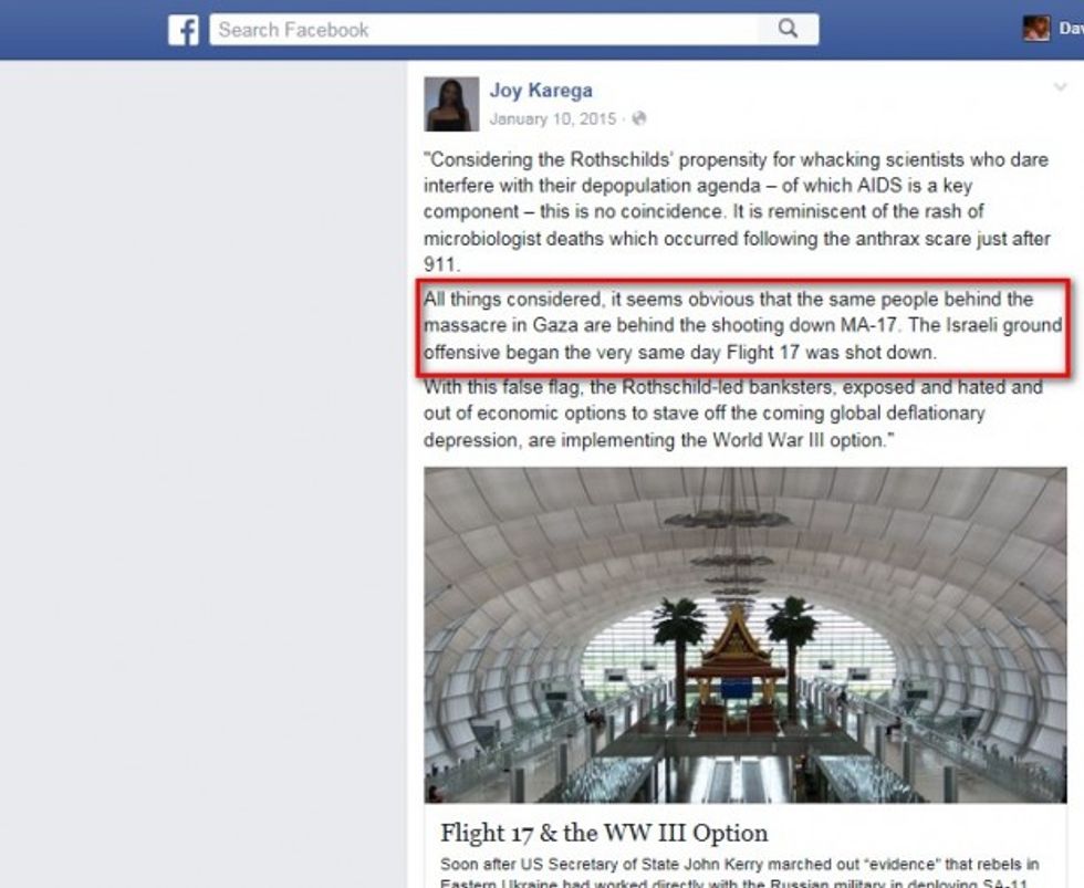One post appeared to blame the “Rothschilds” for the spread of AIDS. In the same post, it appeared that by “Rothschilds,” Karega intended to castigate Jews and/or Israelis.