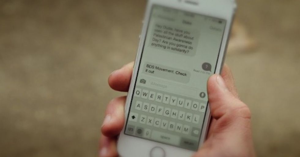 The dramatization shows a man named Wyatt — described as an “average American” churchgoer — who out of the blue gets a text message that reads, “BDS Movement. Check it out.”