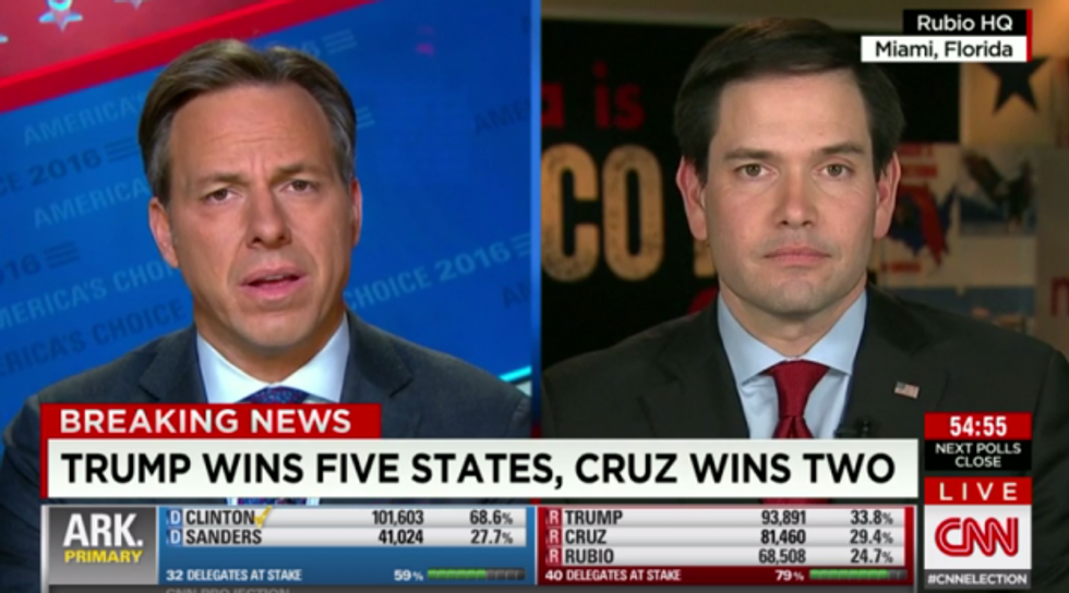 "The past week, you've been relentlessly hammering Donald Trump," Tapper said to Rubio. "Tonight, he won state after state after state. Is it possible that your quarrel is not so much with Donald Trump as it is with Republican primary voters?"