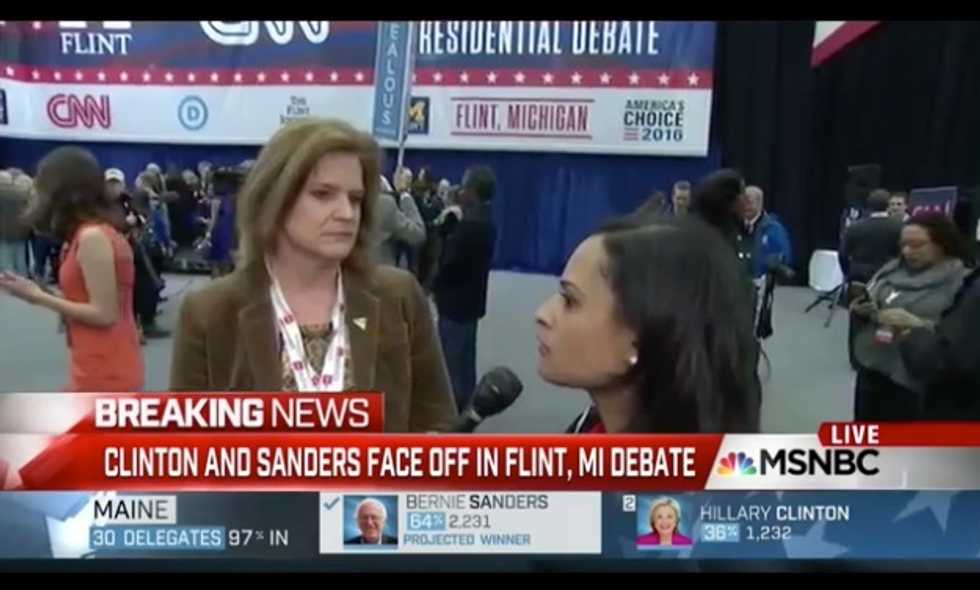 In the spin room following the Democratic presidential debate, reporter Kristen Welker seemed to be unaware that she was on live television when she told Jen Palmieri, director of communications for Clinton’s campaign, “I’m going to ask you about Flint,” a reference to a water crisis in Flint, Michigan.