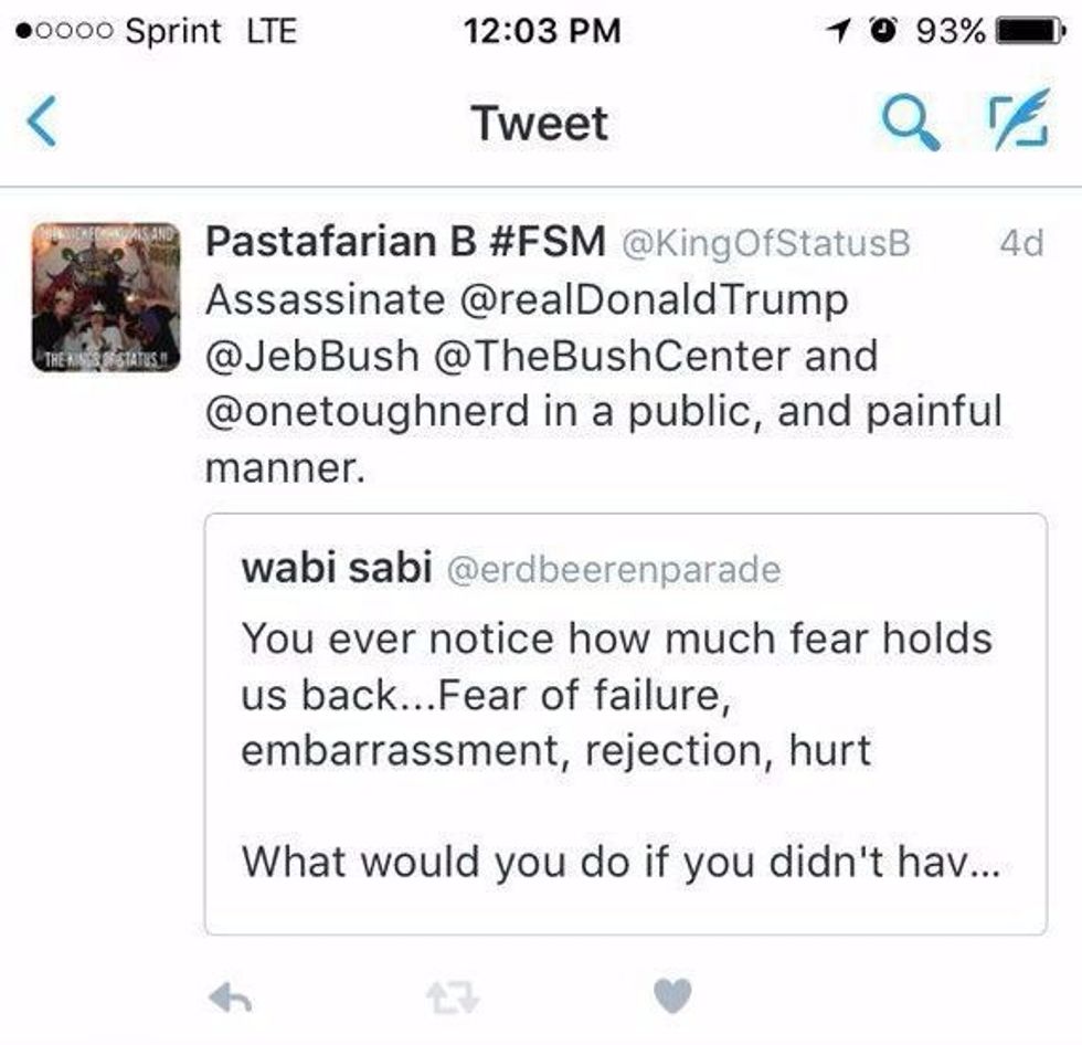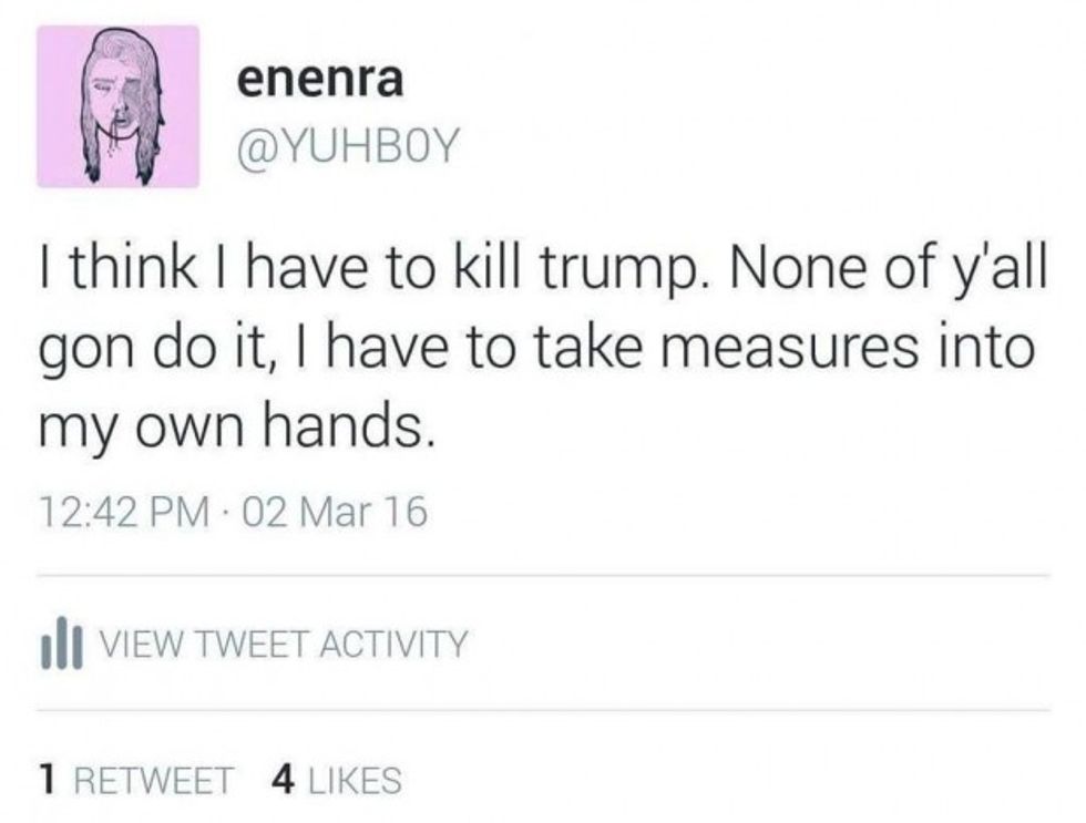 "I think I have to kill Trump," the tweet read. "None of y'all gon do it, I have to take measures into my own hands."