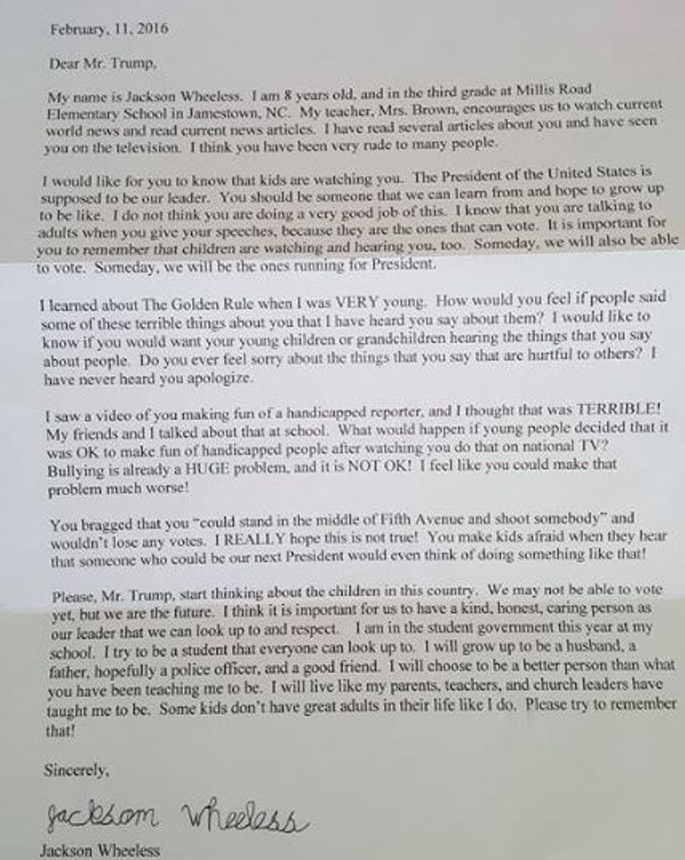 According to WCNC-TV, Jackson was prompted to pen a letter to the brash billionaire after his teacher, Ms. Brown, encouraged her students to watch the news and become informed about the world around them. In his letter, Wheeless made it a point to remind Trump that even though they are unable to cast a vote this election cycle, children are also listening to and watching what he says and does.