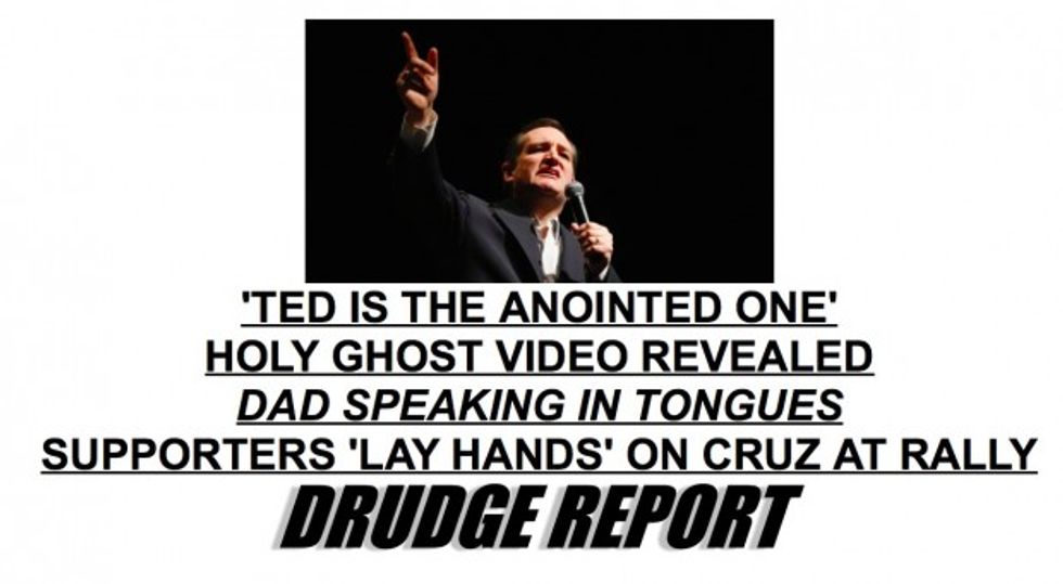 In addition to this video, the Drudge Report also linked to an article about Ted Cruz reportedly being a "closet Pentecostal," a separate clip featuring Rafael Cruz discussing biblical "anointing" and a video showing supporters laying hands on Ted Cruz.