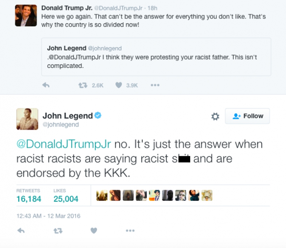 The two started exchanging barbs on Twitter when Legend referred to Trump Jr.'s father, Republican presidential candidate Donald Trump, as a "racist" following the cancellation of his Chicago rally, which was postponed due to violent protests.