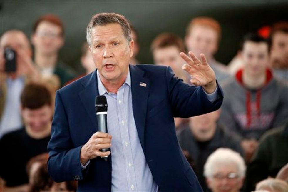 Republican presidential candidate, Ohio Gov. John Kasich speaks during a campaign stop on Monday, March 14, 2016, at the MAPS Air Museum in North Canton, Ohio. (AP Photo/Matt Rourke)