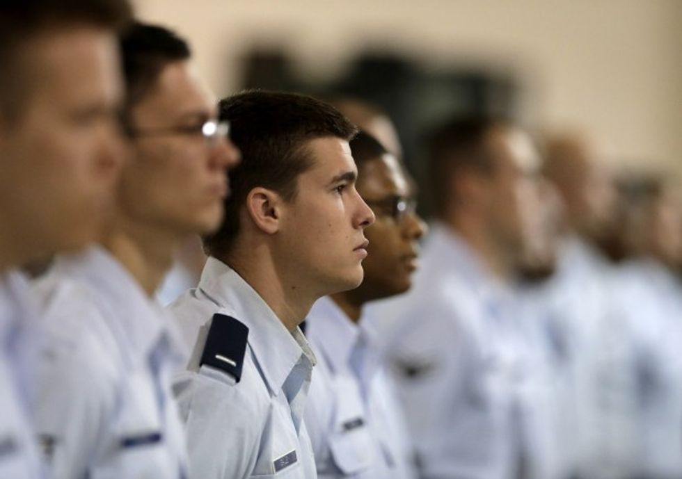Airmen stand at attention during a change of command ceremony for the 91st Missile Wing at Minot Air Force Base, N.D, June 24, 2014. (AP Photo/Charlie Riedel)