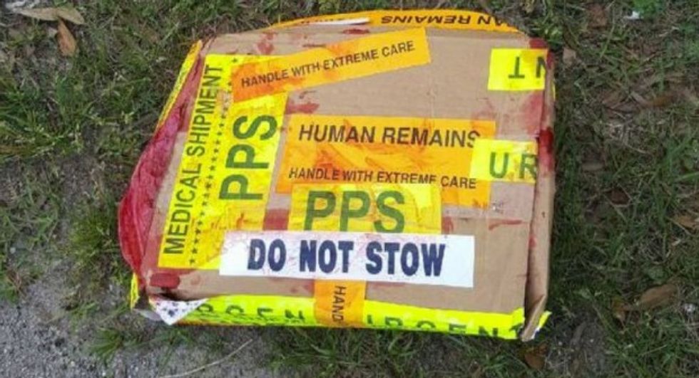 A box labeled “human remains,” covered in what appeared to be blood was found near a ditch last Thursday in Myrtle Beach, South Carolina, WBTW-TV reported.