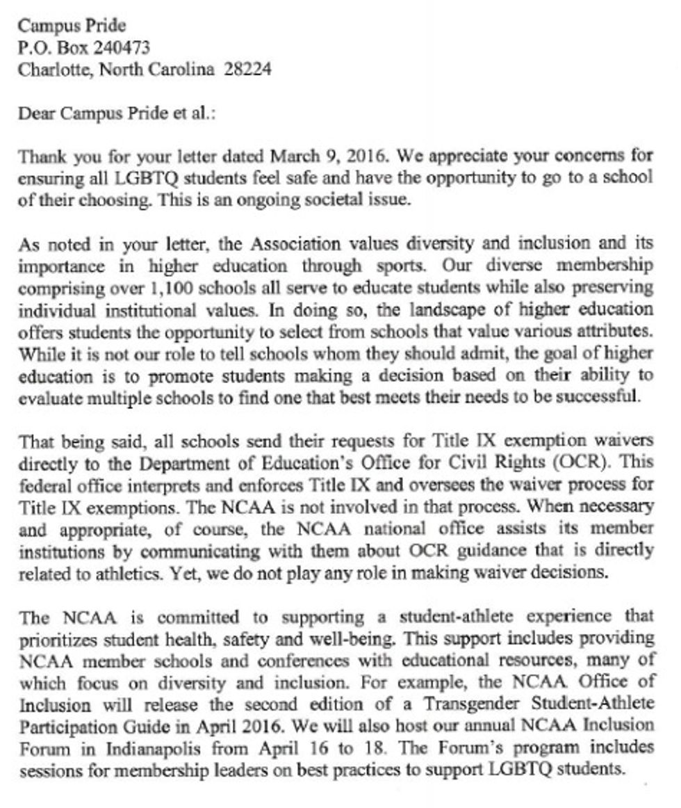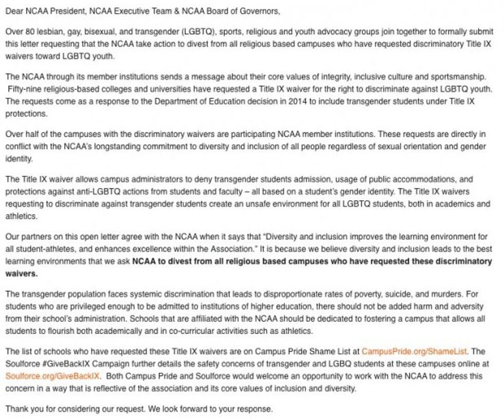 The letter said that the requests by these religious schools — which reportedly increased in prevalence after the Department of Education included transgender protections under Title IX in 2014 — stand in conflict with the NCAA's commitment to diversity, specifically when it comes to LGBTQ rights, and went on to fully explain activists' grievances.