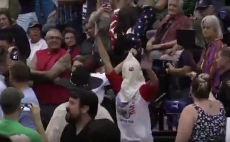 "There's a disgusting guy," Trump yelled after seeing the protester with the KKK-like hood. "He puts a Ku Klux Klan hat on. He thinks he's cute. He's a disgusting guy. That is a disgusting guy."