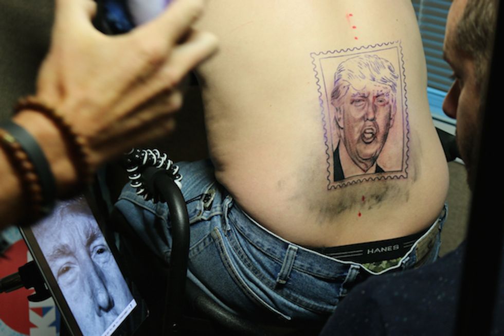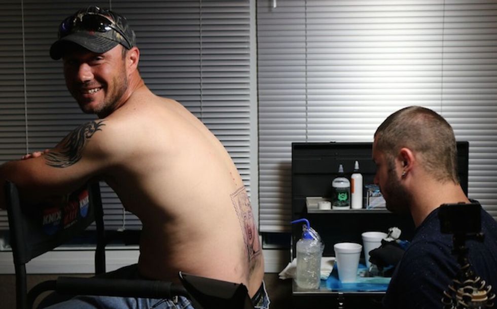 Initially, four people signed up for the Trump tattoo. However, when it came time to start injecting ink into skin, only one person was brave enough to have a possible future president permanently inked onto his back.