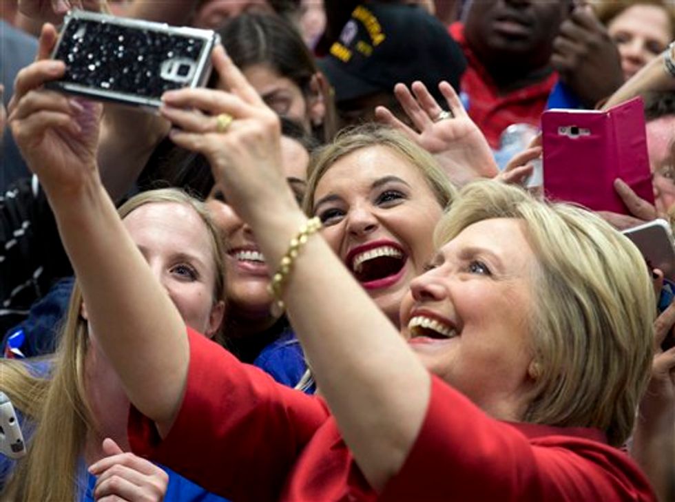 Democratic presidential candidate Hillary Clinton takes photos with supporters in the audience after speaking during a campaign event at Carl Hayden Community High School in Phoenix, Monday, March 21, 2016. (AP Photo/Carolyn Kaster)