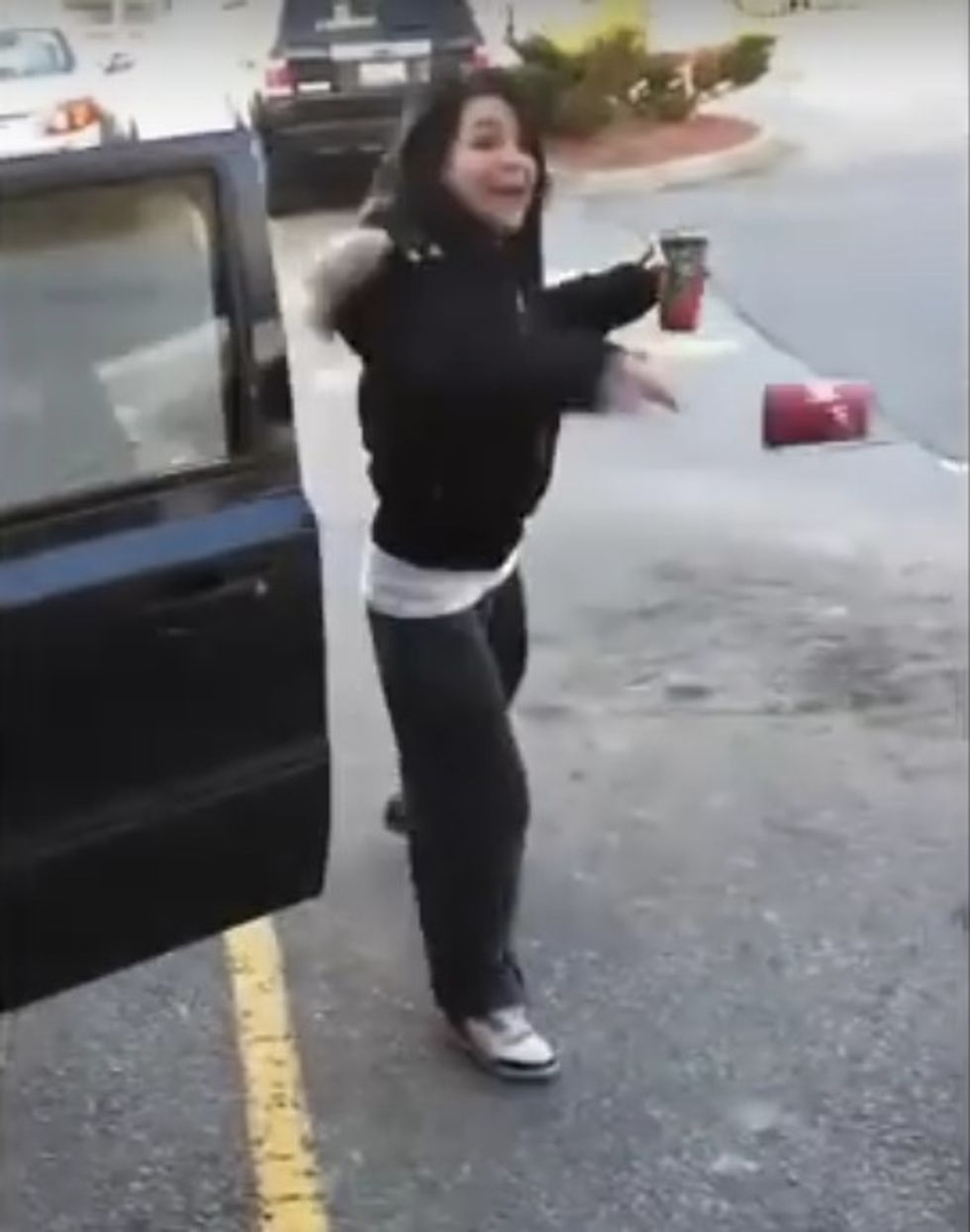 "No," the woman — holding two full cups — replied before entering the vehicle.