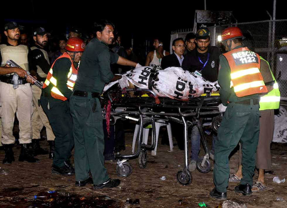 Pakistani rescue workers remove a dead body from the site of bomb explosion in a park in Lahore, Pakistan, Sunday, March, 27, 2016. A bomb blast in a park in the eastern Pakistani city of Lahore has killed tens of people and wounded scores, a health official said. (AP Photo/K.M. Chuadary)