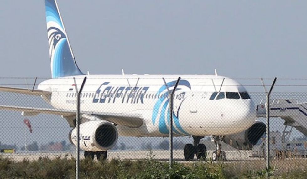 An Egypt Air Airbus A-320 sits on the tarmac of Larnaca aiport after it was hijacked and diverted to Cyprus on March 29, 2016. (STR/AFP/Getty Images)