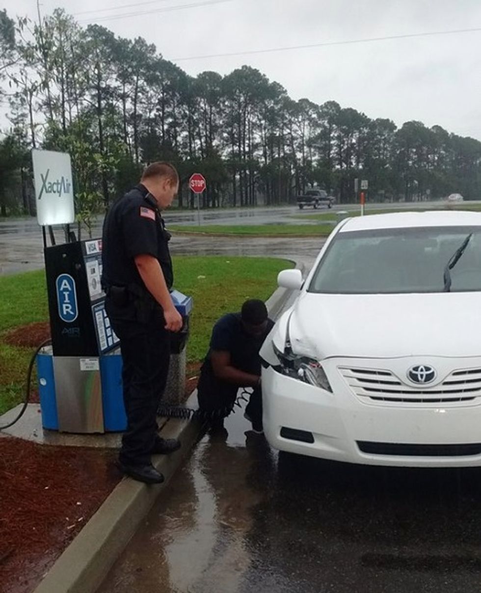 "I saw a city police officer helping and teaching a young brother how to put air in his tires," Dixon wrote on Facebook about the photos he snapped, noting the "heavy rain" pouring down at the time. "This touched my heart because of the negative media about black men and officers of law."