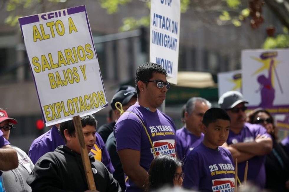 Union workers staged a demonstration in support of a proposal to raise the California minimum wage to $15 by 2022 on March 31, 2016 in Oakland, California. (Photo by Justin Sullivan/Getty Images)