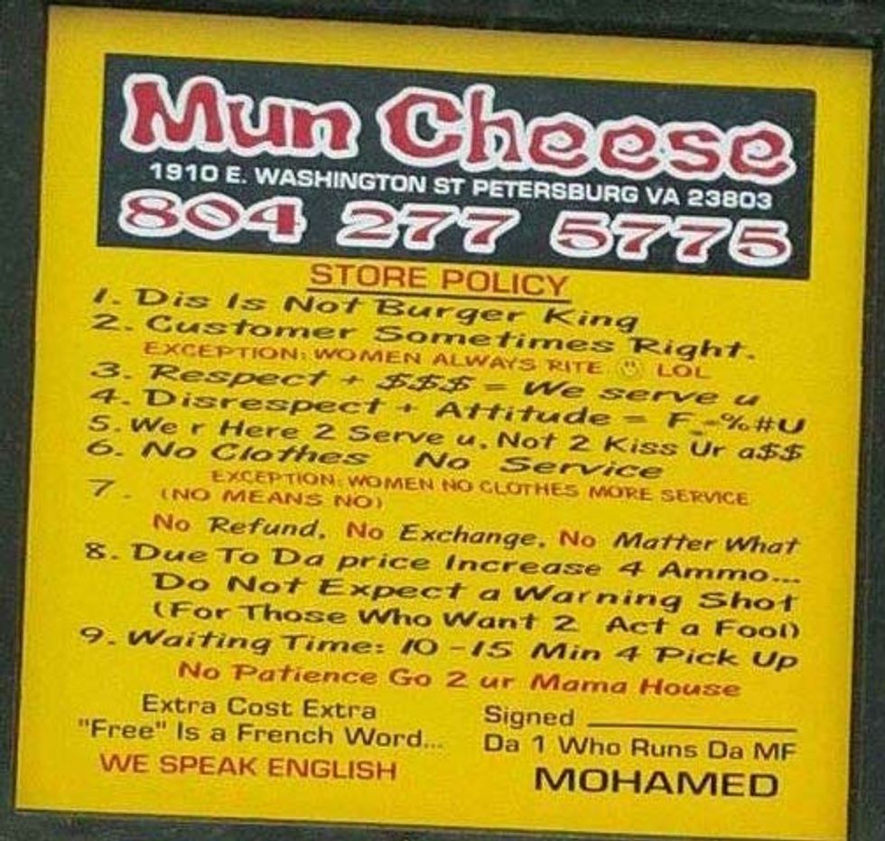 Some of those policies include: "We are here to serve you...not to kiss your @#$'? and Due to 'da' price increase 4 ammo...Do not expect a warning shot (For those who want 2 act a fool)."