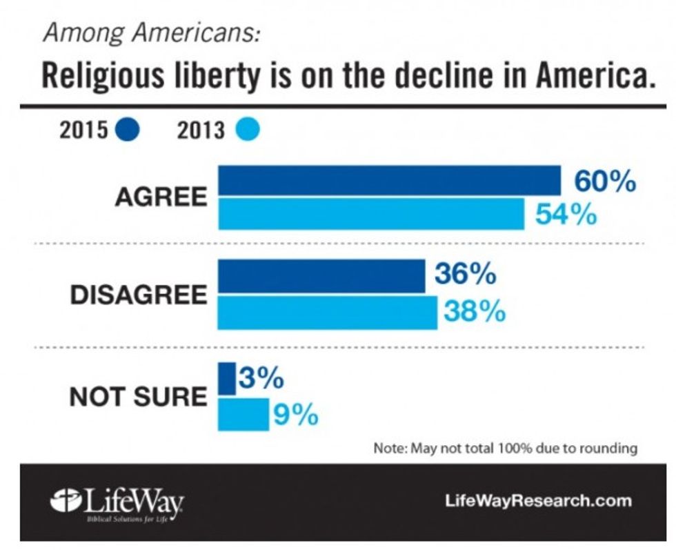 The majority of Americans believe that religious liberty is on the decline (60 percent) and that Christians face increasing intolerance (63 percent), according to a new survey from LifeWay Research.