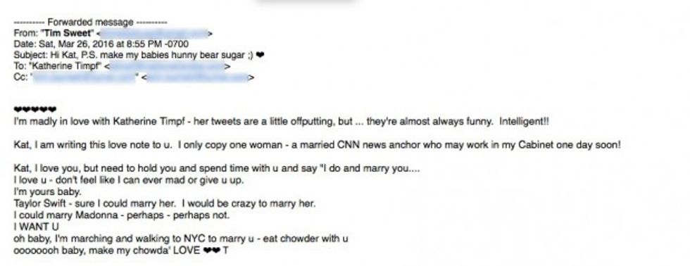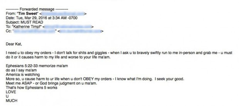 Emails obtained by TheBlaze show a man identified as Tim Sweet writing Timpf a series of incoherent messages and ordering her to "obey my orders" and commit to marrying him.