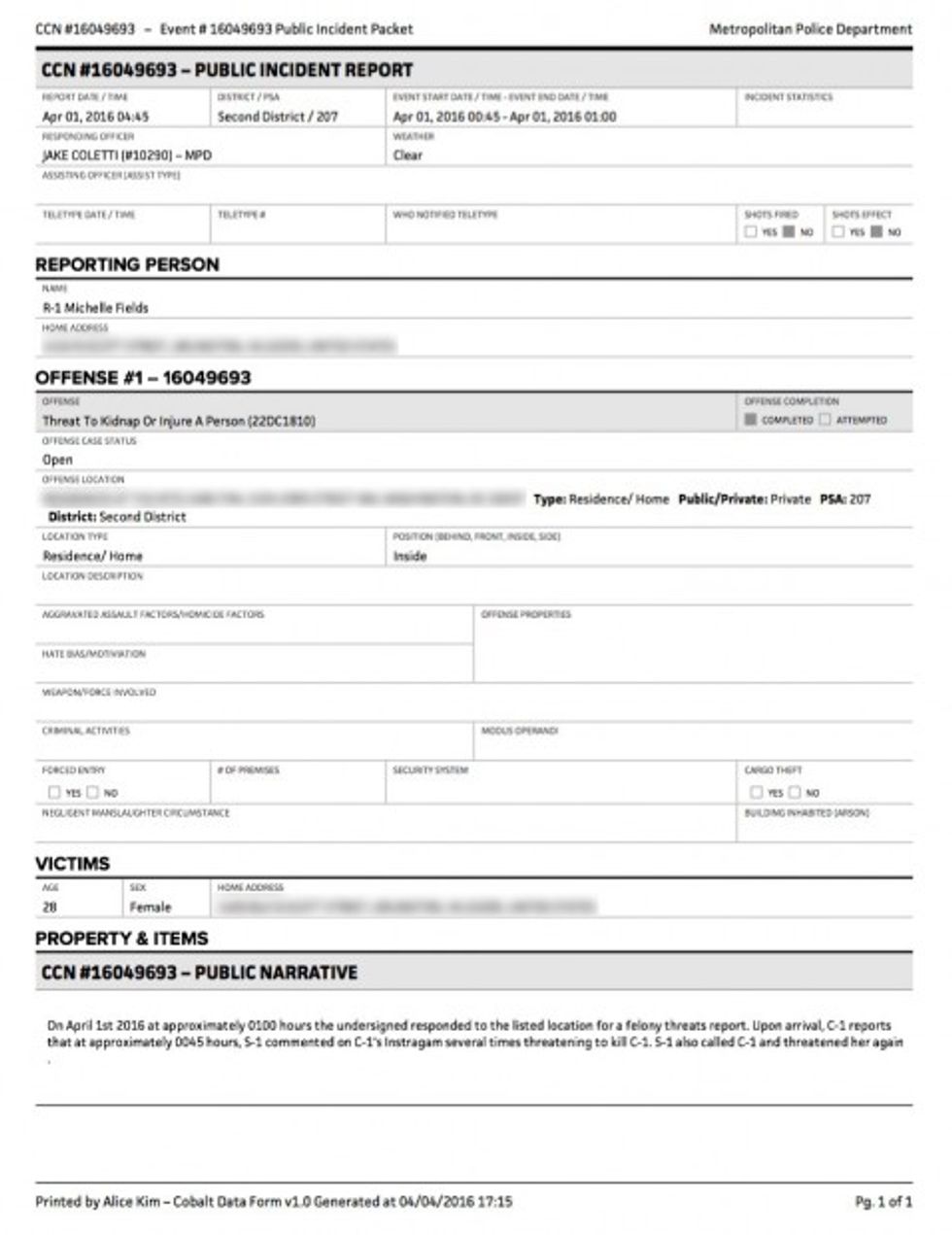 "On April 1st 2016 at approximately 0100 hours the undersigned responded to the listed location for a felony threats report," responding officer Jake Coletti wrote in the report. "Upon arrival, C-1 reports that at approximately 0045 hours, S-1 commented on C-1's Instragam several times threatening to kill C-1. S-1 also called C-1 and threatened her again."