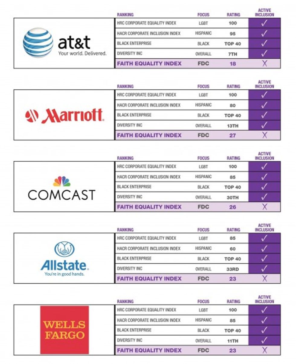 Faith Driven Consumer maintains that AT&T, Marriott, Comcast, Allstate, and Wells Fargo aren't faring too well on the organization's Faith Equality Index, an innovative system that the organization has developed to rank how compatible companies are with faithful consumers’ wants and needs.
