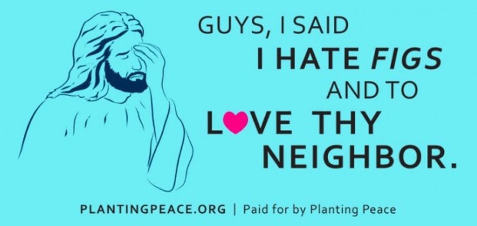 "Our latest billboard sends a message about literal interpretations of the bible and addresses some of the hateful, homophobic language anti-LGBT hate groups often feature on their protest signs," Planting Peace said in a statement released on Tuesday. "In Matthew 21:18-22, Jesus literally curses a fig tree. But we don’t see a lot of 'God Hates Figs' protests or cries for stronger legislation regulating figs."