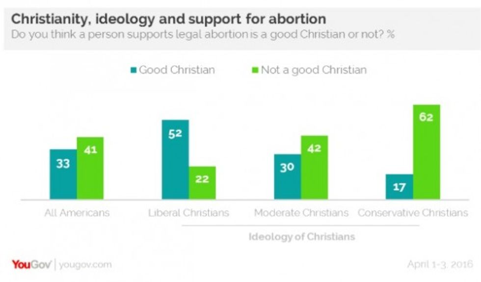 A recent YouGov poll asked Americans whether they think that a person who "supports legal abortion is a good Christian or not," with 33 percent of respondents answering affirmatively.