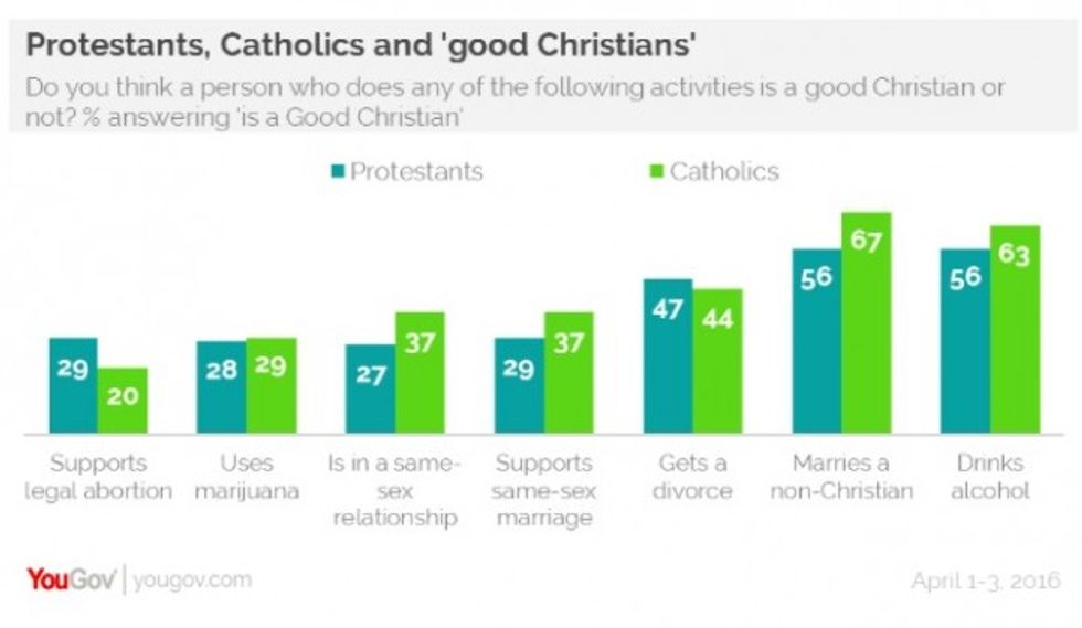 On the gay marriage front, 27 percent of Protestants expressed a belief that an individual who supports same-sex unions is a good Christian compared to 37 percent of Catholics.