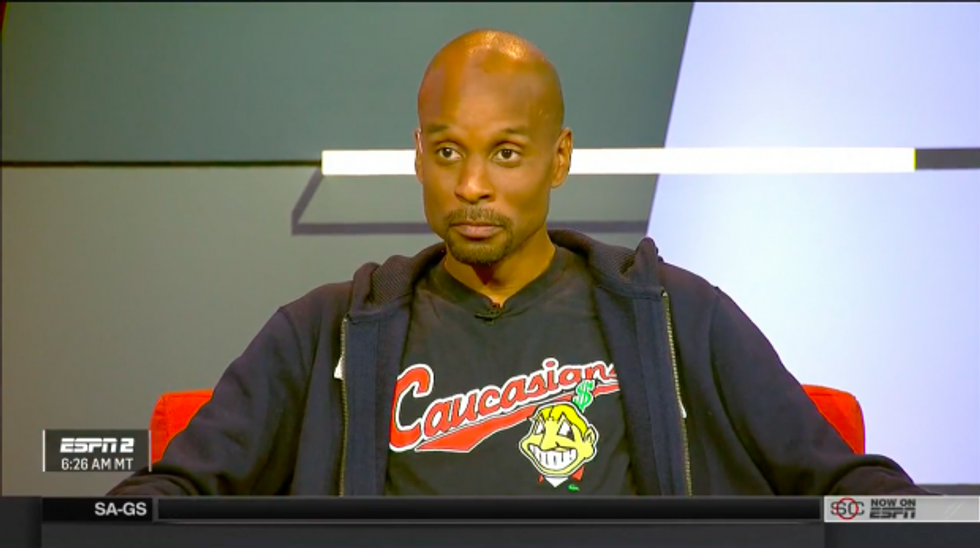 Jones finds the Cleveland team's logo to be offensive, so he wanted to use his TV appearance to make a statement by wearing the controversial Shelf Life Clothing T-shirt. But ESPN wasn't cool with that.