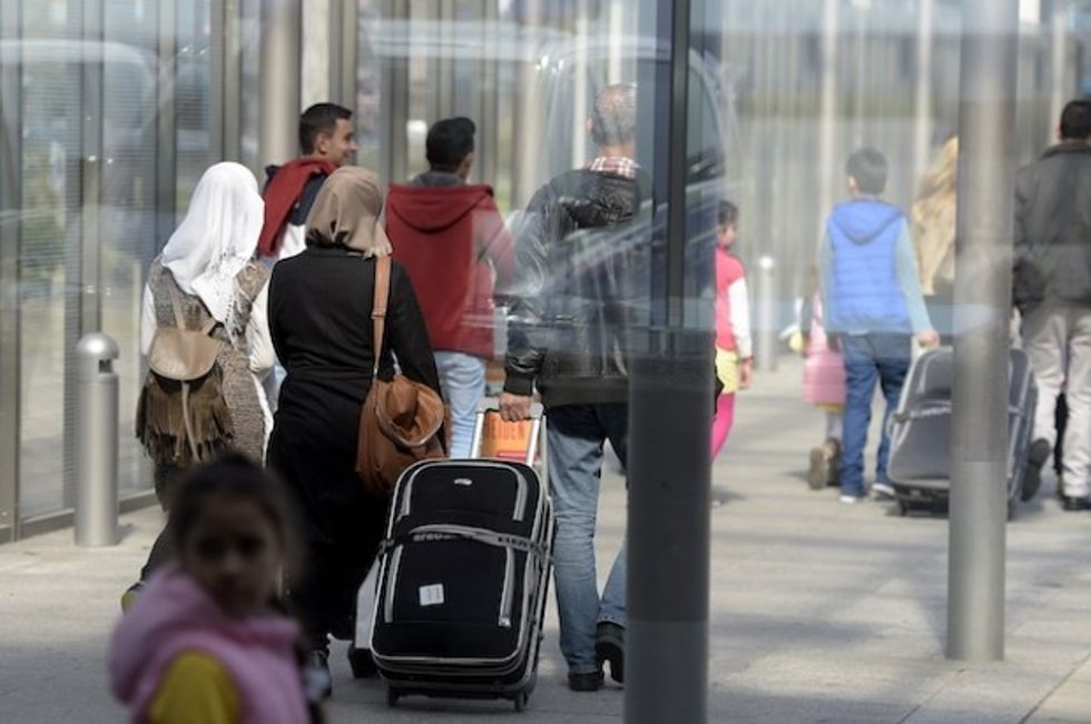 Syrian refugees walk past a hall after landing at Hanover airport, central Germany, on April 4, 2016. The first Syrians arrived in Germany from Istanbul under a controversial EU-Turkey migrant pact. (Tobias Schwarz/AFP/Getty Images)
