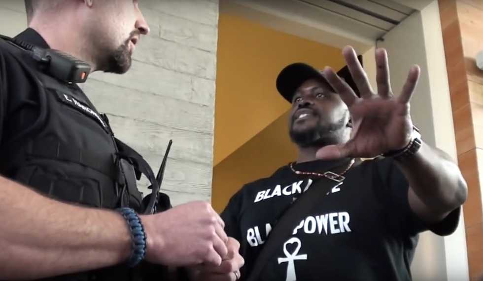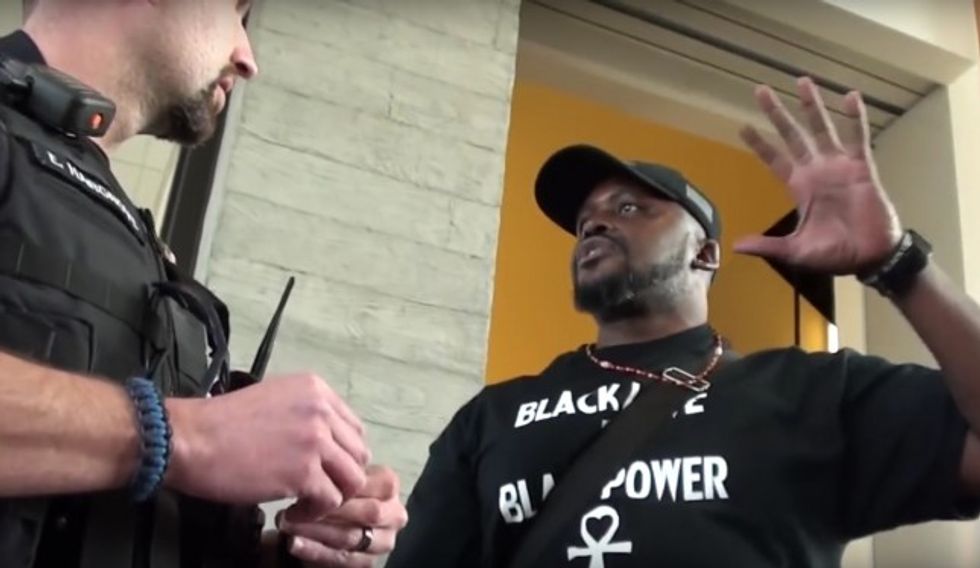 "Our event is about black love, and right now the energy that he's bringing is not in congruence with what we're trying to accomplish," the man told the officer, adding that "if we ask someone to leave the premises, you all should be able to help us in that regard, because he's not bringing the right energy into this."