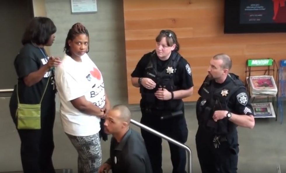 Narrating his clip, the videographer said: "But because no one was causing a disturbance, and it was all in a public area, no one was was ejected." He added that he had a copy of the Oregon statutes allowing him to be there "in case anyone wanted to see it for themselves."