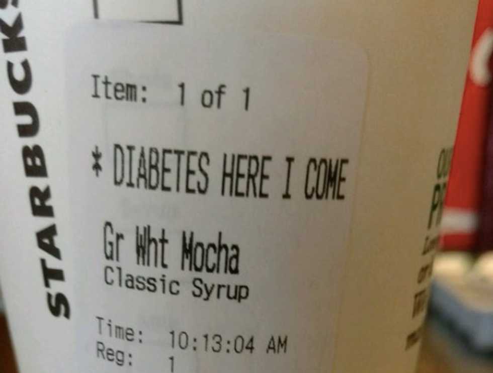 “DIABETES HERE I COME,” the label on his grande white mocha read. The man sent a photo of the rude message to WFOX-TV via Facebook.