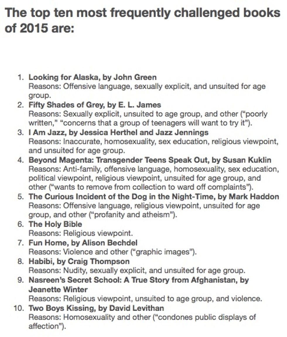 Each year, the American Library Association publishes a list of the top 10 most regularly challenged books in an effort to alert the public to censorship issues in schools and libraries across America. In the current list — which includes complaints waged throughout 2015 — the Bible ranked just four slots down from the sexually explicit book, "Fifty Shades of Grey," which captured the second spot.