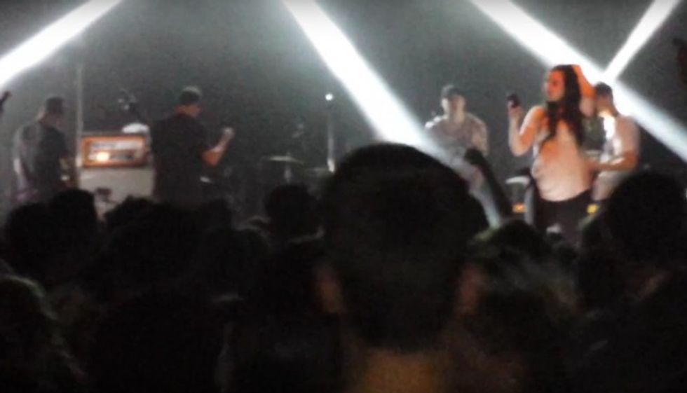 The band's lead singer Parker Cannon apparently had enough of all the waiting around and was seen on the clip running up to the fan from behind and kicking her off the stage — literally.