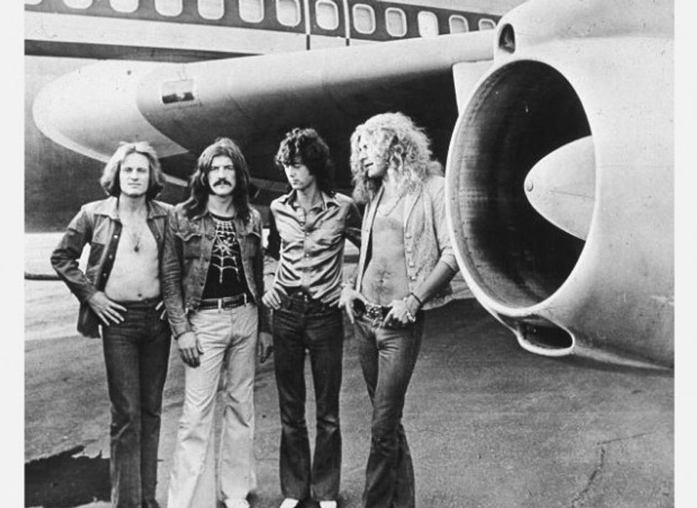 British rock band Led Zeppelin, (left - right): John Paul Jones, John Bonham (1948 - 1980), Jimmy Page and Robert Plant, pose in front of an their private airliner The Starship, 1973. (Photo by Hulton Archive/Getty Images)
