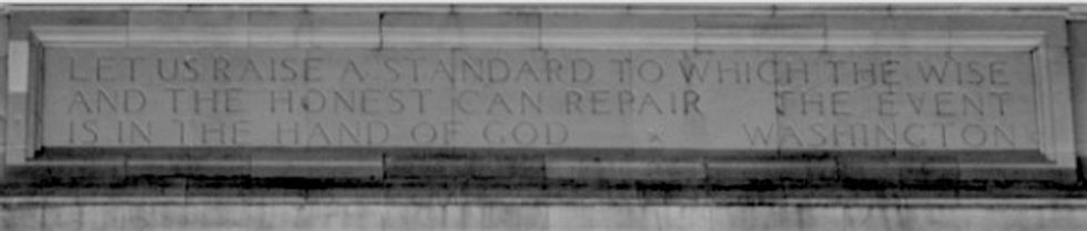 As I watched and listened to the Democratic Socialist repeat his populist pitch to an energized group of loyal supporters, my eyes drifted above Sanders to the words of George Washington carved into the top of the arch.