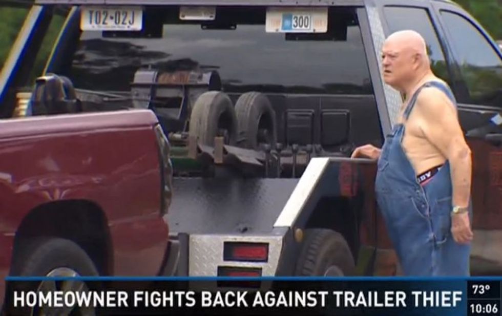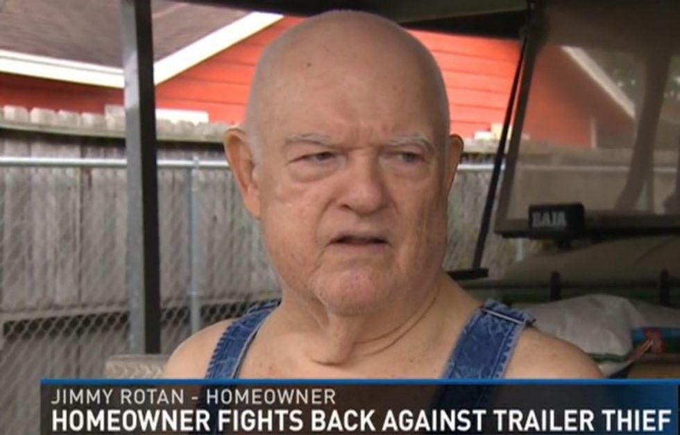 "I grabbed my protection and my phone and I come out," Rotan, shirtless save for denim overalls, told KHOU-TV.