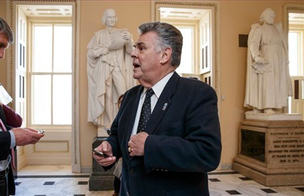 Rep. Peter King R-N.Y. speaks at a Republican Leadership Summit, Friday, April 17, 2015, in Nashua, N.H. (AP Photo/Jim Cole)
