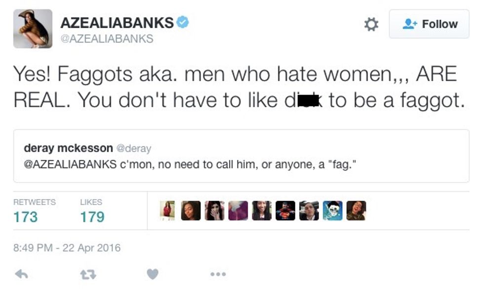 @AZEALIABANKS we've had good and solid convos in the past, this isn't me fighting. The word is homophobic and offensive, Azealia.