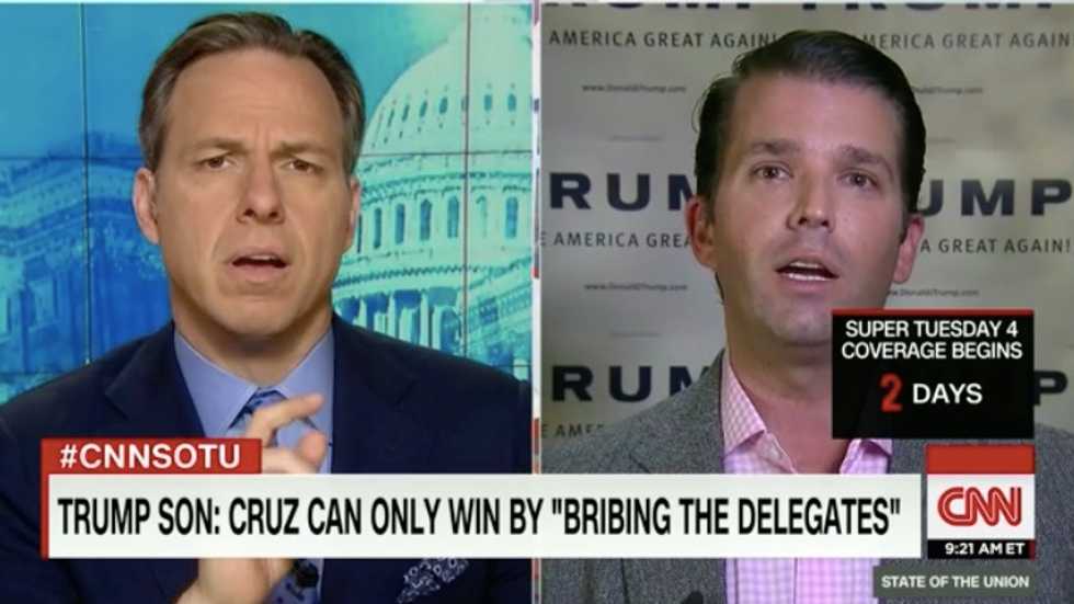 The GOP front-runner’s son told host Jake Tapper that the only way Trump would lose to Texas Sen. Ted Cruz would be if Cruz bribed delegates in exchange for their support.